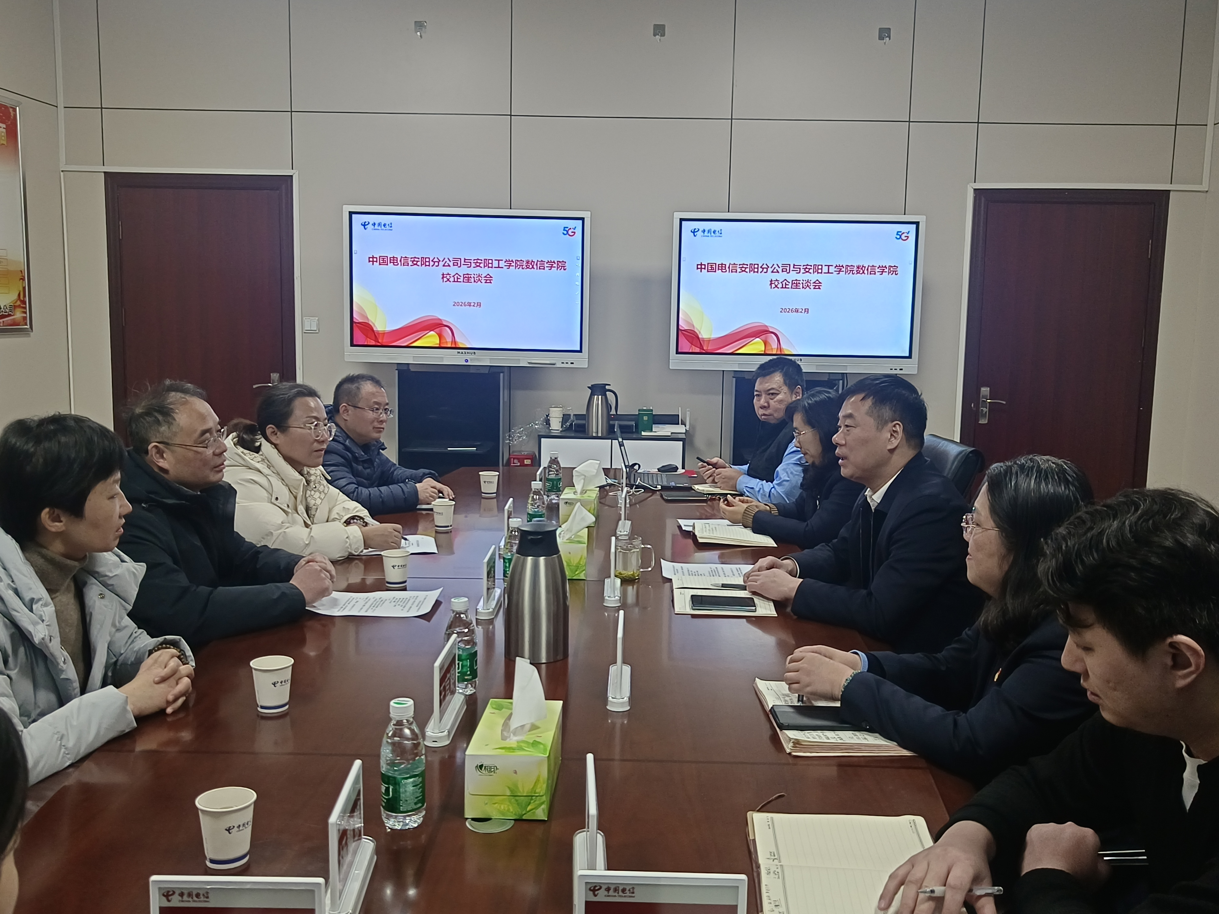为深化产教融合、拓宽毕业生就业渠道,精准对接行业人才需求,2月3日上午,数信学院党委书记王锋、副书记付国华、副院长王宜静等一行5人赴中国电信集团有限公司安阳分公司开展校企合作交流活动。中国电信集团有限公司安阳分公司副总经理王名扬及相关部门负责人参加了此次座谈。